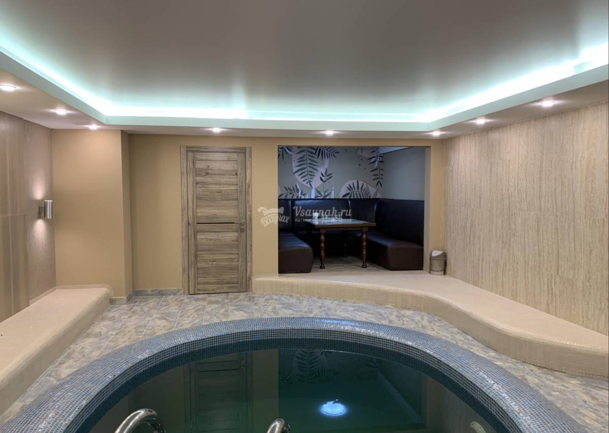 Парная с эффектом русской бани без использования веников на 6 человек, бассейн в центре зала 3х3 м и глубиной 1,6 м с подсветкой и постоянной фильтрацией воды. Отдельная комната для бильярда с девятифутовым русским столом и диваном. Одна комната отдыха.